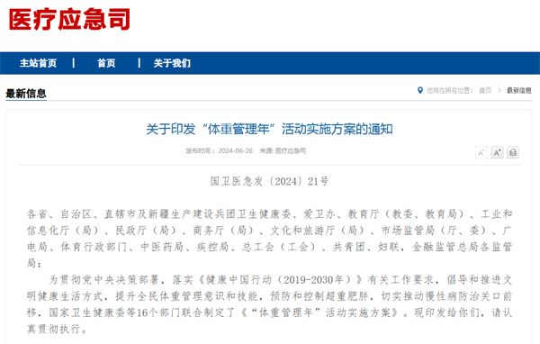 2024年6月,國家衛(wèi)生健康委聯(lián)合16個(gè)部門印發(fā)《“體重管理年”活動實(shí)施方案》,標(biāo)志著我國進(jìn)入“體重管理元年”。該方案以三年為周期,旨在通過多樣化形式和跨部門協(xié)作探索體重管理新模式,構(gòu)建全民健康新格局。