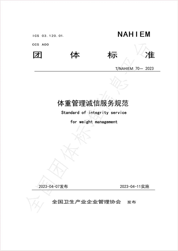 《體重管理誠信服務(wù)規(guī)范》(T/NAMIEM 70-2023)團體標(biāo)準(zhǔn)于2023年4月正式發(fā)布實施。為積極響應(yīng)“體重管理年”關(guān)于全民科學(xué)體重管理的要求,加快推進(jìn)體重管理行業(yè)標(biāo)準(zhǔn)化、規(guī)范化建設(shè),現(xiàn)全面開展《體重管理誠信服務(wù)規(guī)范》團體標(biāo)準(zhǔn)執(zhí)行工作。